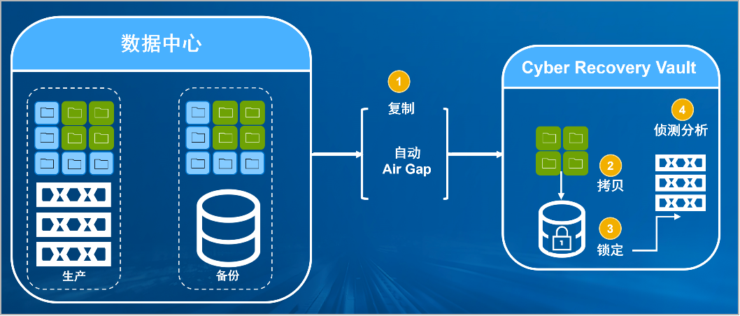 Omipay防勒索病毒方案将生产中心备份数据复制到Vault区,复制后网络自动断开实现弹性隔离。Vault区的数据快速拷贝,并对拷贝版本加锁(在锁定期数据不允许删除和修改)。Vault沙箱内对拷贝版本进行扫描分析,验证数据是否完好。